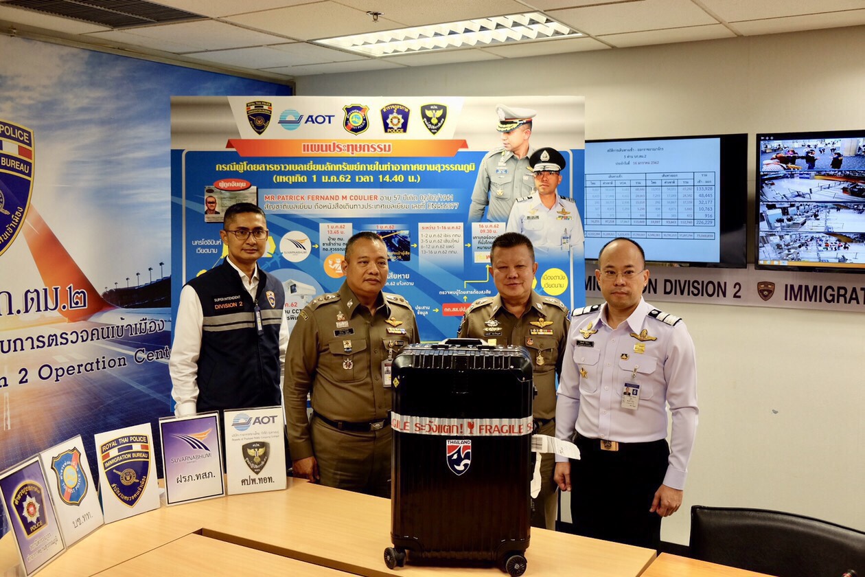 ท่าอากาศยานสุวรรณภูมิร่วมกับกองบังคับการตรวจคนเข้าเมือง 2 และ สถานีตำรวจภูธรท่าอากาศยานสุวรรณภูมิแถลงข่าวการจับกุมผู้ต้องหาขโมยทรัพย์สินผู้โดยสาร นายกิตติพงศ์ กิตติขจร รองผู้อำนวยการท่าอากาศยานสุวรรณภูมิ (สายปฎิบัติการ 1) บริษัท ท่าอากาศยานไทย จำกัด (มหาชน) หรือ ทอท. เปิดเผยว่า เมื่อวันที่ 16 มกราคม 2562 เวลา 09.00 น. ฝ่ายรักษาความปลอดภัย ท่าอากาศยานสุวรรณภูมิ (ทสภ.) และศูนย์ปฏิบัติการพิเศษ ทอท. ร่วมกับชุดสืบสวน สภ.ท่าอากาศยานสุวรรณภูมิ ชุดสืบสวนตำรวจตรวจคนเข้าเมือง กองบังคับการตรวจคนเข้าเมือง 2 เข้าจับกุมนายแพททริค เฟอร์นานด์ เอ็ม คูเลียร์ อายุ 58 ปี สัญชาติเบลเยี่ยม ขณะกำลังเช็คอินที่เคาน์เตอร์ตรวจบัตรโดยสารสายการบินเวียดเจ็ทแอร์ Row Check-in U-3 อาคารผู้โดยสารขาออก ชั้น 4 เพื่อจะเดินทางไปยังเมืองดานัง ประเทศเวียดนาม ด้วยเที่ยวบินVZ960