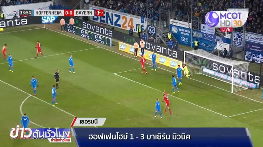 ฟุตบอลบุนเดสลีกา เยอรมนี เมื่อคืนที่ผ่านมา ฮอฟเฟนไฮม์ เปิดบ้านพบกับ บาเยิร์น มิวนิก รองจ่าฝูง เกมนี้ เสือใต้ มาได้ประตูออกนำก่อน 1 ประตูต่อ 0 จากจังหวะที่ โรเบิร์ต เลวานดอฟสกี้ โหม่งในจังหวะแรก ประตูเจ้าถิ่นปัดบอลไปเข้าทาง เลออน กอเรตซ์กา ยิงมุมแคบเข้าไปในนาทีที่ 34
