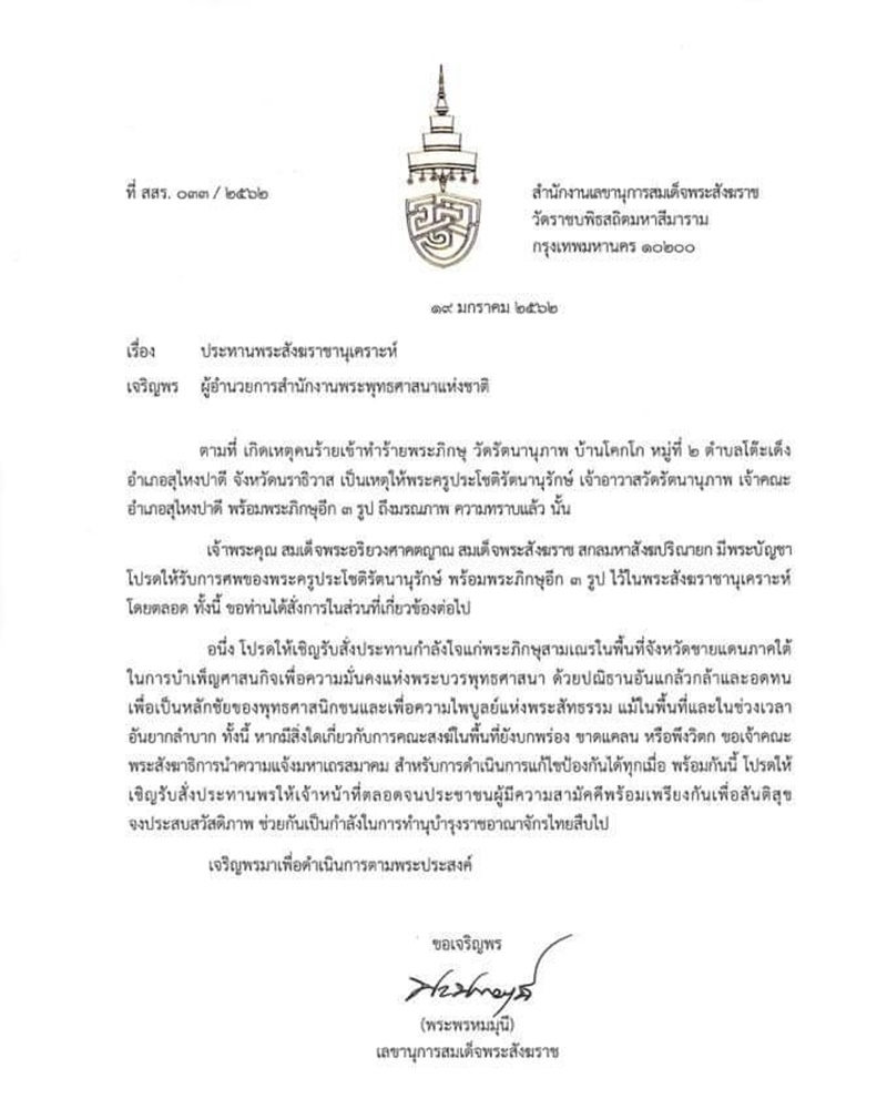อนึ่ง โปรดให้เชิญรับสั่งประทานกำลังใจแก่พระภิกษุสามเณรในพื้นที่จังหวัดชายแดนภาคใต้ในการบำเพ็ญศาสนกิจเพื่อความมั่นคงแห่งพระบวรพุทธศาสนา ด้วยปณิธานอันแกล้วกล้าและอดทน เพื่อเป็นหลักชัยของพุทธศาสนิกชนและเพื่อความไพบูลย์แห่งพระสัทธรรม แม้ในพื้นที่และในช่วงเวลาอันยากลำบาก ทั้งนี้ หากมีสิ่งใดเกี่ยวกับการคณะสงฆ์ในพื้นที่ยังบกพร่อง ขาดแคลน หรือพึงวิตก ขอเจ้าคณะพระสังฆาธิการนำความแจ้งมหาเถรสมาคม สำหรับการดำเนินการแก้ไขป้องกันได้ทุกเมื่อ