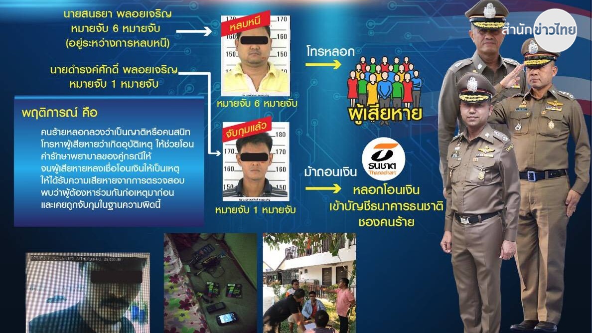 พลตำรวจโทสุรเชษฐ์ หักพาล ผู้บัญชาการสำนักงานตรวจคนเข้าเมือง ในฐานะรองผู้อำนวยการศูนย์ปราบปรามอาชญากรรมทางเทคโนโลยีสารสนเทศ สำนักงานตำรวจแห่งชาติหรือ ศปอส.ตร. แถลงจับกุมนายดำรงค์ศักดิ์ พลอยเจริญ หลังร่วมกับนายสนธยา พลอยเจริญ ที่ยังหลบหนี อ้างเป็นญาติผู้เสียหายและเกิดอุบัติเหตุต้องชดใช้ค่ารักษาพยาบาลให้คู่กรณี จนผู้เสียหายหลงเชื่อโอนเงินให้ สอบพบทำลักษณะนี้มาแล้วหลายครั้ง โดยคนหนึ่งจะหาข้อมูลแล้วโทรศัพท์หลอกผู้เสียหาย ส่วนอีกคนจะทำหน้าที่ถอนเงินที่ได้จากการหลอก