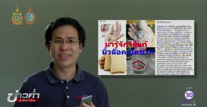 กรุงเทพฯ 2 ก.ย.-สังคมออนไลน์มีการแชร์ว่าขนมปังกับน้ำส้มสายชูแก้นิ้วล็อกได้ เรื่องนี้จริงหรือไม่ ติดตามกับศูนย์ชัวร์ก่อนแชร์.-สำนักข่าวไทย