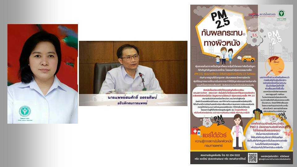 พญ.มิ่งขวัญ วิชัยดิษฐ ผู้อำนวยการสถาบันโรคผิวหนัง กรมการแพทย์ กล่าวเพิ่มเติมว่า การสัมผัสกับฝุ่นดังกล่าวอย่างต่อเนื่องเป็นเวลานาน เป็นปัจจัยหนึ่งที่ทำให้ผิวเสื่อมชราได้เร็วขึ้น นอกเหนือจากปัจจัยทางแสงแดดและการสูบบุหรี่ การศึกษาในประเทศเยอรมนีและประเทศจีน พบว่าการสัมผัสกับฝุ่นละอองขนาดเล็กเป็นเวลานานมีผลทำให้ผิวเสื่อมชรา โดยพบการเกิดจุดด่างดำเพิ่มมากขึ้นบริเวณใบหน้า และการเกิดริ้วรอยบริเวณร่องแก้มมากยิ่งขึ้นด้วย