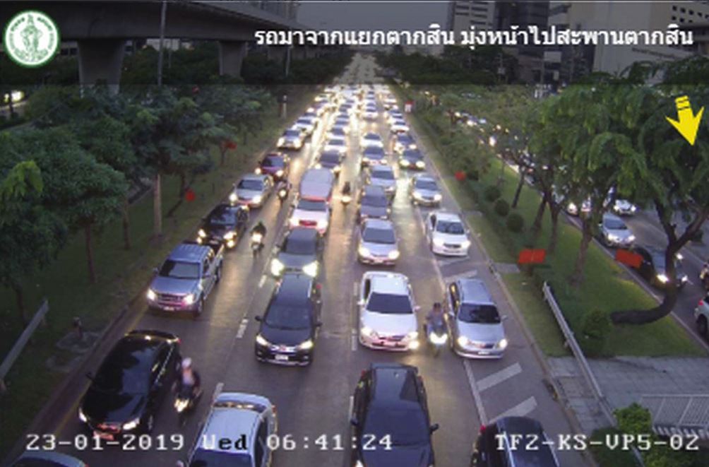 กทม. 23 ม.ค.-สวพ.FM91 รานงานจราจรเช้าวันพุธถนนกรุงธนบุรี ขาเข้า มุ่งหน้าสะพานตากสิน การจราจรติดขัดมาก ท้ายแถวสะสมอยู่ที่ใต้บีทีเอสวงเวียนใหญ่