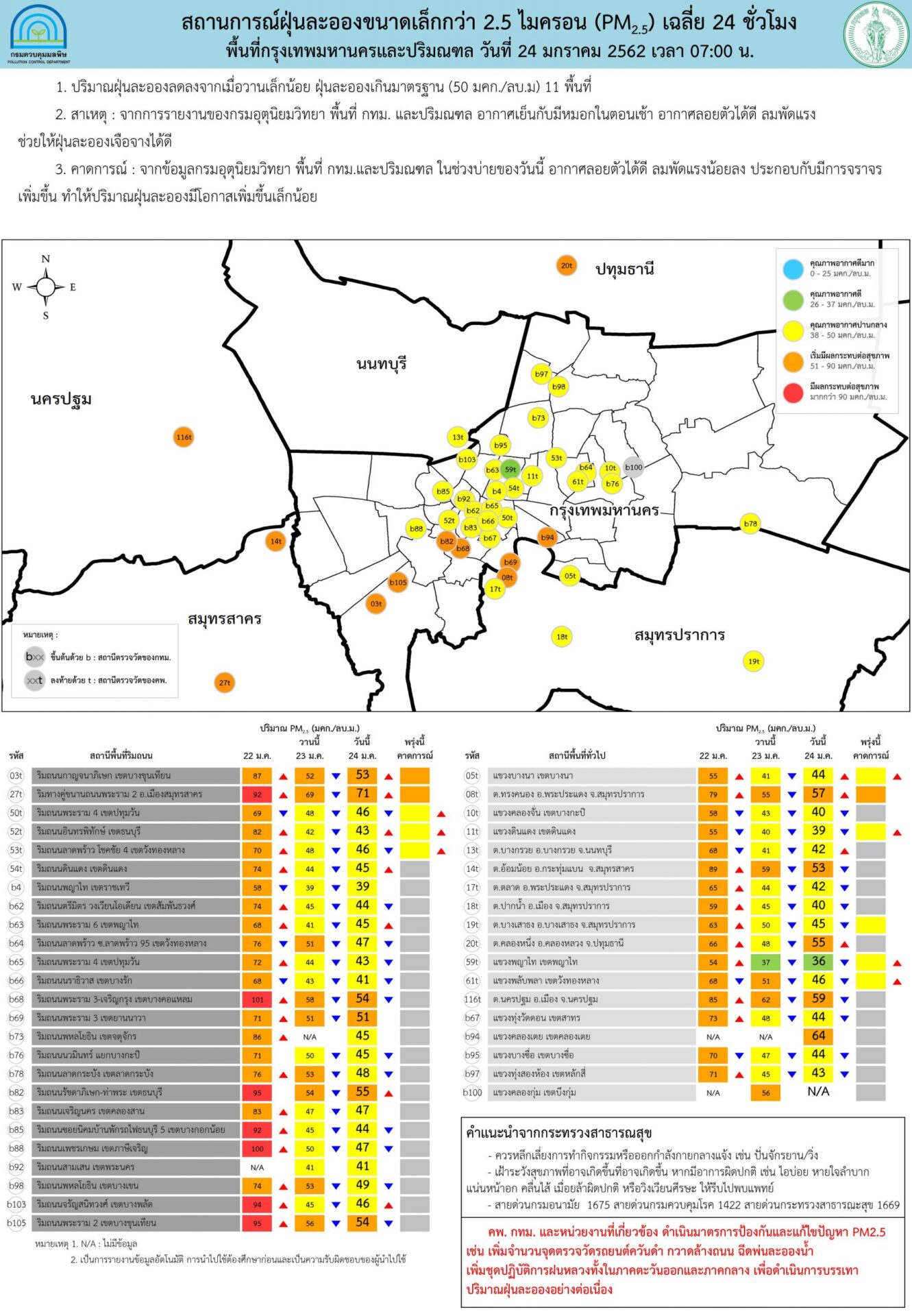 สำนักสิ่งแวดล้อม กทม.โดยกองจัดการคุณภาพอากาศและเสียง รายงานสถานการณ์ฝุ่นละอองขนาดไม่เกิน 2.5 ไมครอน (pm2.5) ของสถานีตรวจวัดคุณภาพอากาศของกรุงเทพมหานคร ประจำวันพฤหัสบดีที่ 24 มกราคม พ.ศ. 2562 เวลา 08.00 น ค่าเฉลี่ย 24 ชั่วโมง ของฝุ่นละอองขนาดไม่เกิน 2.5 ไมครอน (PM2.5) ตรวจวัดได้ 39-65 ไมโครกรัม/ลูกบาศก์เมตร (มคก./ลบ.ม.) พบว่าเกินมาตรฐาน (มาตรฐานไม่เกิน 50 มคก./ลบ.ม.) จำนวน 6 บริเวณ คือ