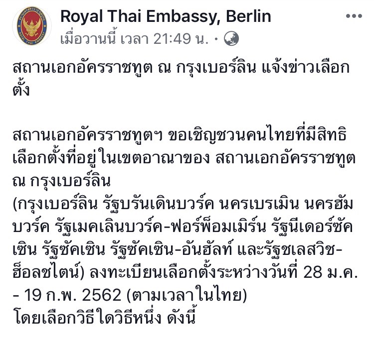ผู้สื่อข่าวรายงานว่า สถานเอกอัครราชทูต ณ กรุงเบอร์ลิน โพสข้อความผ่านทางเฟซบุ๊ก “Royal Thai Embassy, BERlin” เชิญชวนคนไทยที่มีสิทธิเลือกตั้งที่อยู่ในเขตอาณาของ สถานเอกอัครราชทูต ณ กรุงเบอร์ลิน (กรุงเบอร์ลิน รัฐบรันเดินบวร์ค นครเบรเมิน นครฮัมบวร์ค รัฐเมคเลินบวร์ค-ฟอร์พ็อมเมิร์น รัฐนีเดอร์ซัคเซิน รัฐซัคเซิน รัฐซัคเซิน-อันฮัลท์ และรัฐชเลสวิช-ฮ็อลชไตน์) ลงทะเบียนเลือกตั้งระหว่างวันที่ 28 ม.ค. – 19 ก.พ. 2562 (ตามเวลาในไทย) โดยเลือกวิธีใดวิธีหนึ่ง คือลงทะเบียนด้วยตนเอง โดยกรอกแบบฟอร์มออนไลน์ด้วยตนเองทาง www.khonthai.com (คลิกเลือก ลงทะเบียนขอใช้สิทธิเลือกตั้งนอกราชอาณาจักรทางอินเทอร์เน็ต) โดยต้องมี บัตรประชาชนรุ่นสมาร์ทการ์ดฝังชิป และ หนังสือเดินทาง (Passport) ที่ยังไม่หมดอายุ เพื่อใช้ข้อมูลกรอกลงในแบบฟอร์มออนไลน์ โดยวิธีนี้เป็นวิธีที่สะดวก รู้ผลรวดเร็วที่สุด และสามารถแก้ไขปรับเปลี่ยนสถานที่ที่ใช้สิทธิลงคะแนนเองได้ เมื่อกรอกข้อมูลครบถ้วนแล้ว ระบบจะยืนยันการลงทะเบียนให้