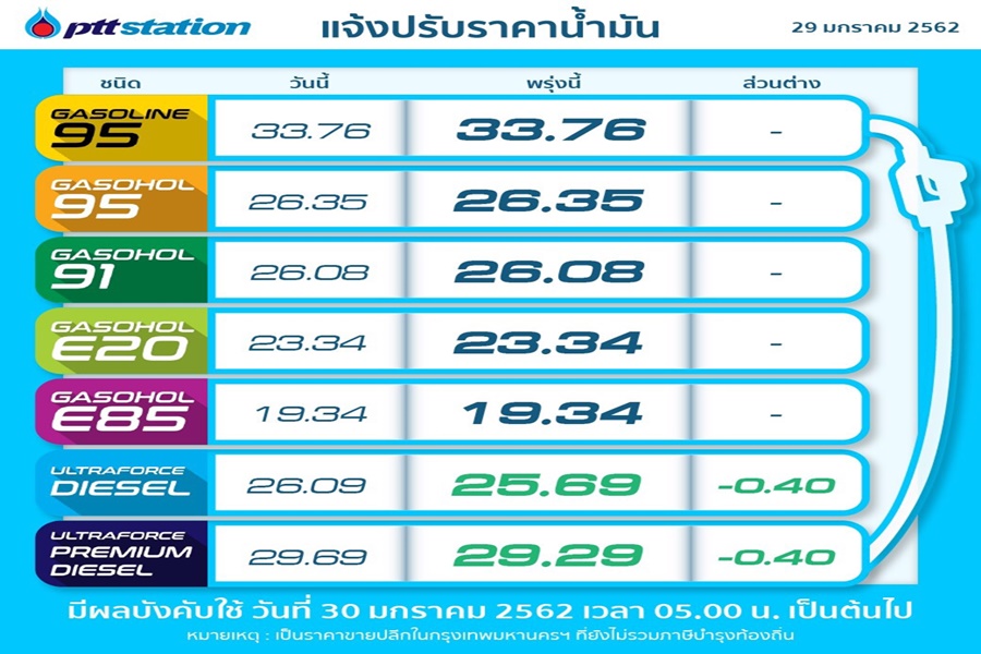บมจ.ปตท.และบางจากฯ ปรับลดราคาขายปลีกน้ำมันดีเซลและดีเซลพรีเมี่ยม 40 สตางค์ต่อลิตร ส่วนชนิดอื่นคงเดิม มีผล 30 มกราคม 2562 เวลา 05.00 น. เป็นต้นไป โดยราคาขายปลีกจะเป็นดังนี้ เบนซิน 95 ลิตรละ 33.76 บาท แก๊สโซฮอล์ 95 ลิตรละ 26.35 บาท E20 ลิตรละ 23.34 บาท แก๊สโซฮอล์ 91 ลิตรละ 26.08 บาท E85 ลิตรละ 19.34 บาท ดีเซล 25.69 บาท และดีเซลพรีเมี่ยม 29.29 บาทต่อลิตร โดยราคาขายปลีกข้างต้นยังไม่รวมภาษีบำรุงกรุงเทพมหานคร.-สำนักข่าวไทย