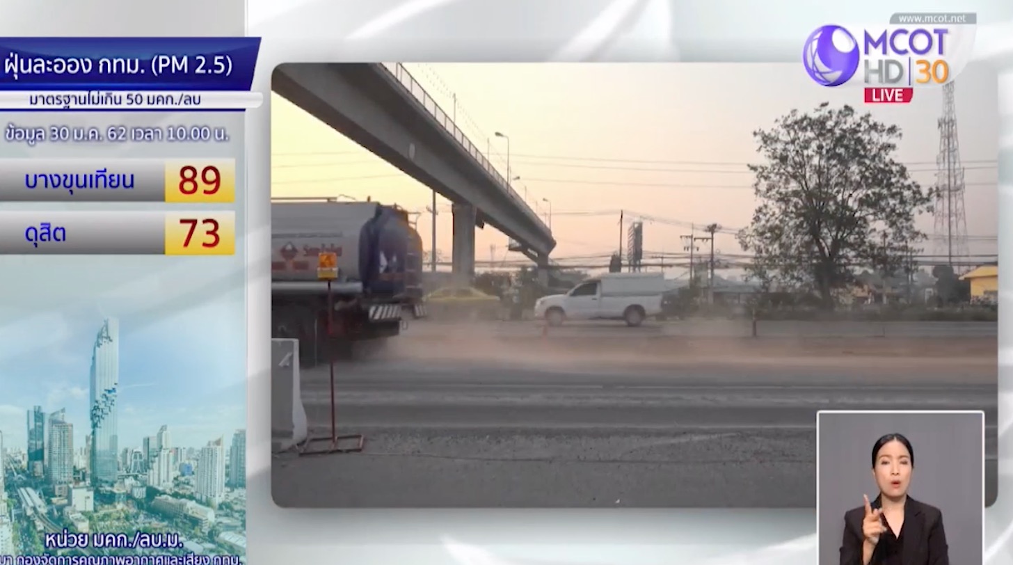 กทม. 30 ม.ค.- เช้าวันนี้ฝุ่นละออง ถนนพระราม 2 พุ่งไม่หยุดทะลัก 145 ไมโครกรัมต่อลูกบาศก์เมตร ขณะที่ทั่ว กทม.และปริมณฑลฝุ่นละอองเกินมาตรฐานถึง 39 พื้นที่