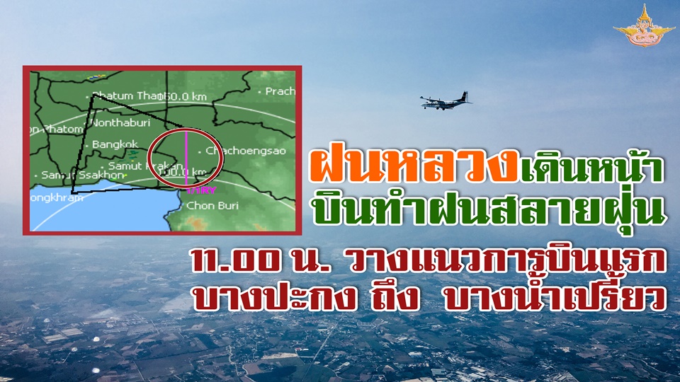 นายสุรสีห์ กล่าวเพิ่มเติมว่า จากผลการติดตามสภาพอากาศของสถานีเรดาร์ฝนหลวงสัตหีบเมื่อช่วงเวลา 08.00 น. พบว่าวันนี้มีค่าเฉลี่ยความชื้นสัมพัทธ์ที่ระดับเกิดเมฆค่อนข้างดีอยู่ที่ร้อยละ 80 ค่าความชื้นสัมพัทธ์ที่ระดับการพัฒนาตัวของเมฆอยู่ในเกณฑ์ที่ดีเช่นกันอยู่ที่ร้อยละ 73 แม้ว่าค่าดัชนีการยกตัวของอากาศจะยังเป็นค่าบวกอยู่ที่ 0.3 ซึ่งไม่เอื้อต่อการเกิดเมฆมากนัก แต่คาดการณ์ว่าความร้อนจากแสงอาทิตย์จะช่วยให้ค่าการยกตัวของเมฆเริ่มดีขึ้นได้ในช่วงสาย ทำให้มีสภาพที่เหมาะต่อการขึ้นปฏิบัติการฝนหลวงมากขึ้น ดังนั้น วันนี้หน่วยปฏิบัติการฝนหลวงเคลื่อนที่เร็วจังหวัดระยองจึงได้ตัดสินใจขึ้นปฏิบัติการในเวลา 11.00 น. สำหรับขั้นตอนที่ 1 คือ สร้างแกนให้เมฆก่อตัว โดยได้วางแนวปฏิบัติการทางทิศใต้ของ อ.บางปะกง ไปถึงบริเวณ อ.บางน้ำเปรี้ยว จ.ฉะเชิงเทรา หวังผลให้เมฆก่อตัวและลอยเข้าพื้นที่กรุงเทพมหานครฝั่งตะวันออกและปริมณฑลบริเวณจังหวัดสมุทรปราการ ซึ่งโอกาสที่จะมีฝนตกในพื้นที่เป้าหมายประมาณร้อยละ 50