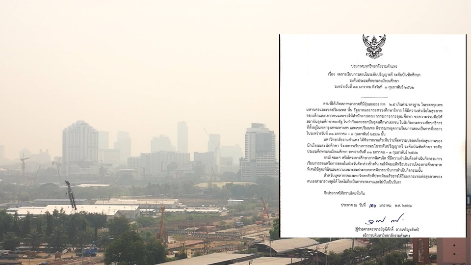 สำนักข่าวไทย 30 ม.ค.-ม.รามฯ ประกาศหยุดการเรียนการสอนชั่วคราวทุกระดับ 31 ม.ค.-1 ก.พ.นี้ เพื่อสุขภาพของนักเรียนและนักศึกษา จากปัญหาฝุ่นเล็ก PM2.5