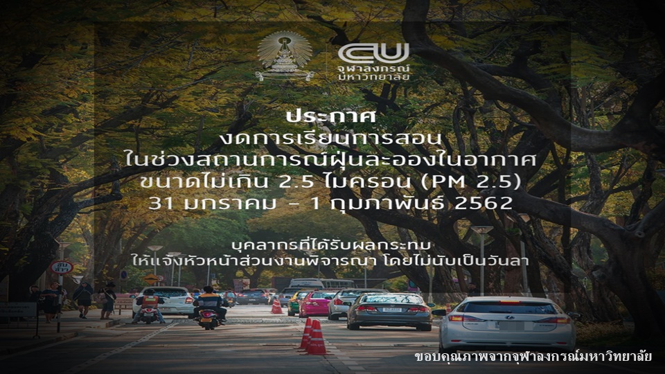 ตามที่มีสถานการณ์ฝุ่นละอองในอากาศขนาดไม่เกิน 2.5 ไมครอน(PM2.5) ในพื้นที่กรุงเทพมหานครและปริมณฑล ในปริมาณที่เกิดกว่าค่ามาตรฐานและอาจเป็นอันตรายต่อสุขภาพ จุฬาลงกรณ์มหาวิทยาลัย พิจารณาแล้วเห็นว่าเพื่อสุขภาพอนามัยของนักเรียน นิสิต และบุคลากรของมหาวิทยาลัย