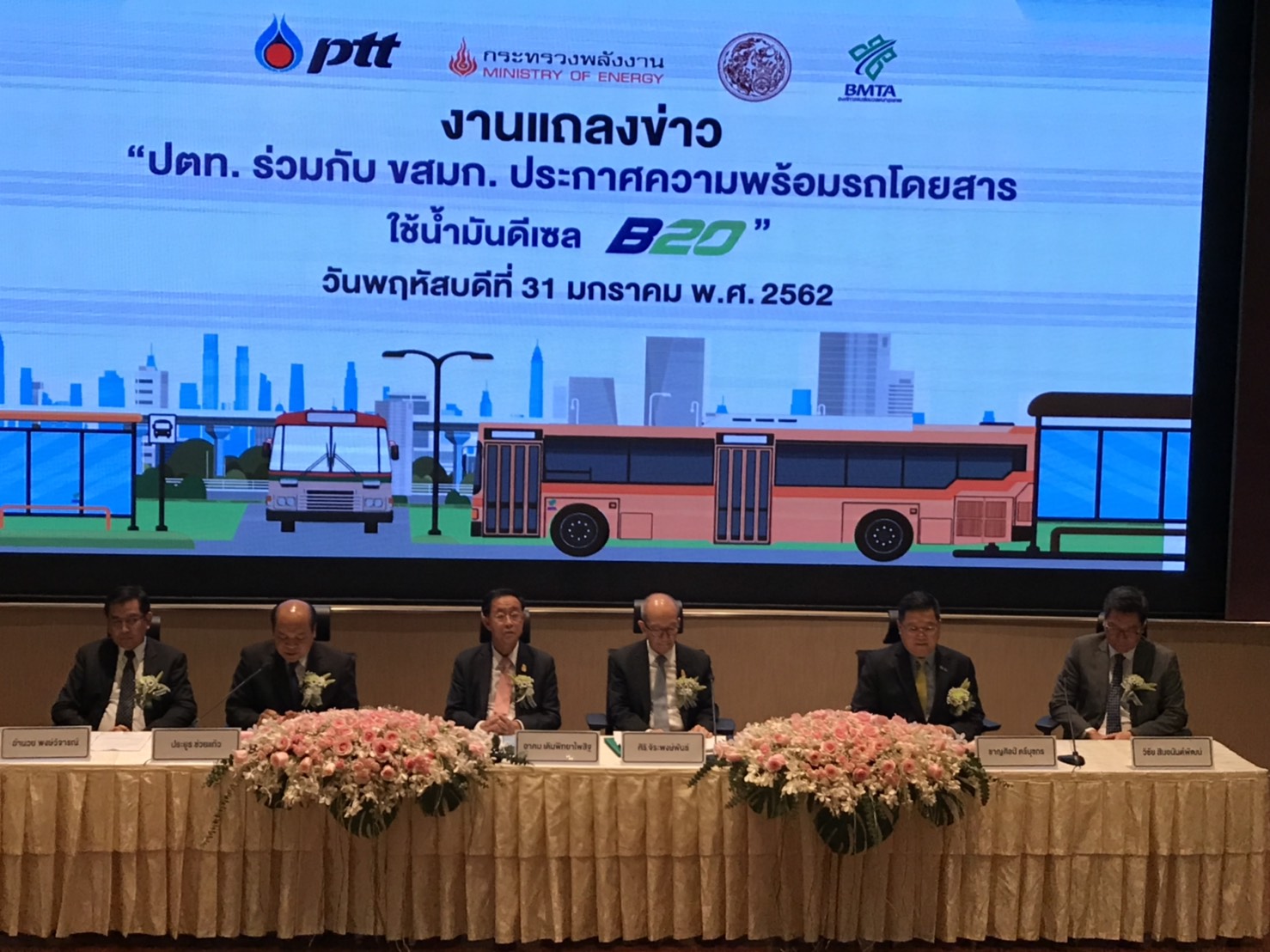 นายอาคม เติมพิทยาไพสิฐ รัฐมนตรีว่าการกระทรวงคมนาคม และนายศิริ จิระพงษ์พันธ์ รัฐมนตรีว่าการกระทรวงพลังงาน ร่วมกันเป็นประธานในงานแถลงข่าวบริษัท ปตท. จำกัด (มหาชน) ร่วมกับองค์การขนส่งมวลชนกรุงเทพ (ขสมก.) ประกาศความพร้อมรถโดยสารใช้น้ำมันดีเซลบี 20