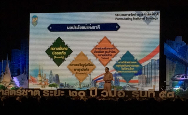 นายกรัฐมนตรี กล่าวว่า ยุทธศาสตร์ด้านและการเมืองและความมั่นคง ไม่สามารถเข้าไปแทรกแซงการทำงานของฝ่ายบริหารได้ เพราะจะถูกมองว่าไม่เป็นประชาธิปไตย แต่สามารถตีกรอบด้วยการวางโครงการ กิจกรรม และผลสัมฤทธิ์ได้ เพื่อให้รัฐบาลดำเนินการตามแผนที่วางไว้ มีการตรวจสอบโดยคณะกรรมการยุทธศาสตร์ชาติ และกลไกของรัฐสภา ซึ่งรัฐบาลจะต้องชี้แจงแผนการทำงานเป็นระยะ