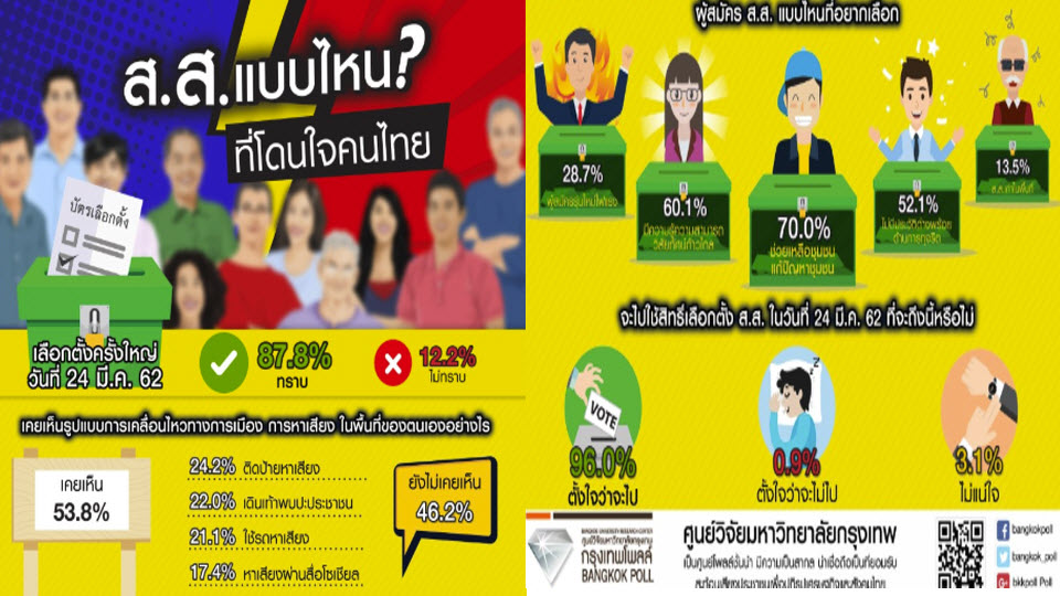 กรุงเทพโพลล์ โดยศูนย์วิจัยมหาวิทยาลัยกรุงเทพ สำรวจความคิดเห็นประชาชน เรื่อง “ส.ส. แบบไหนที่โดนใจคนไทย” เก็บข้อมูลกับประชาชนจากทุกภูมิภาคทั่วประเทศ จำนวน 1,199 คน พบว่า ประชาชนส่วนใหญ่ ร้อยละ 87.8 ทราบว่าจะมีการเลือกตั้งครั้งใหญ่ในวันที่ 24 มี.ค. 62 ขณะที่ ร้อยละ 12.2 ไม่ทราบ