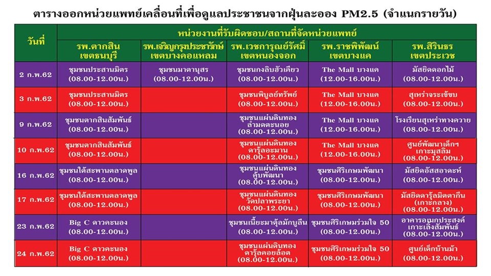 พล.ต.อ.อัศวิน ขวัญเมือง ผู้ว่าราชการกรุงเทพมหานคร โพสต์ผ่านเฟซบุ๊กส่วนตัว ‘ผู้ว่าฯอัศวิน’ ระบุว่าทุกวันเสาร์และวันอาทิตย์ ตลอดเดือน ก.พ.นี้ ต่อเนื่องไปจนกว่าสถานการณ์ฝุ่นละอองจะดีขึ้น กทม.ได้จัดหน่วยแพทย์เคลื่อนที่จากโรงพยาบาลในสังกัด กทม.และศูนย์บริการสาธารณสุขกรุงเทพมหานคร 68 แห่งออกหน่วยเคลื่อนที่หมุนเวียนไปตามชุมชนต่างๆ ในพื้นที่ 50 เขต ดูแลสุขภาพของพี่น้องประชาชน เพื่อตรวจรักษาและให้คำแนะนำในการป้องกันตนเองและเฝ้าระวังโรคที่เกิดจากปัญหาฝุ่นละออง เนื่องจากบางพื้นที่ค่าฝุ่นละออง PM2.5 อยู่ในระดับที่ส่งผลกระทบต่อระบบทางเดินหายใจ หัวใจ หลอดเลือด และการมองเห็น