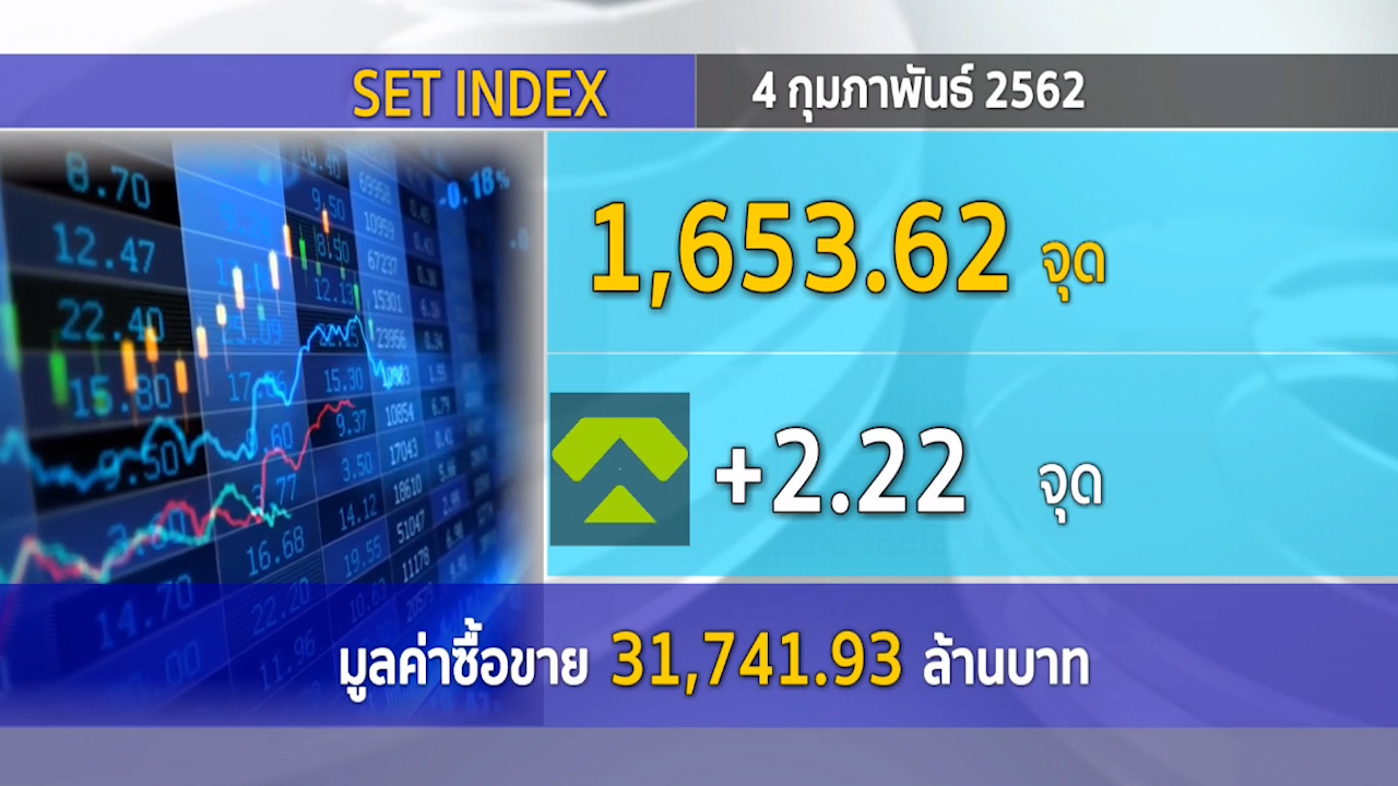 กทม. 4 ก.พ.-ตลาดหุ้นไทย (4 ก.พ.) ปิดการซื้อขายที่ 1,653.62 จุด บวก 2.22 จุด มูลค่าการซื้อขาย 31,741.93 ล้านบาท.-สำนักข่าวไทย