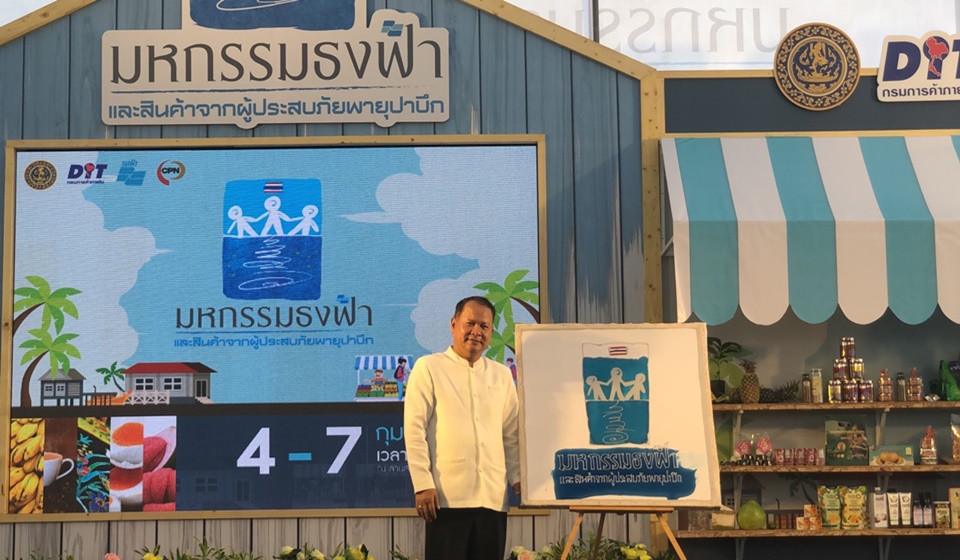 นายวิชัย โภชนกิจ อธิบดีกรมการค้าภายใน เปิดเผยว่า กรมการค้าภายในได้จัดงานมหกรรมธงฟ้าและสินค้าจากผู้ประสบภัยพายุปาบึกระหว่างวันที่ 4-7 กุมภาพันธ์ 2562 ลานหน้าศูนย์การค้าเซ็นทรัลเวิลด์ เขตปทุมวัน กรุงเทพมหานคร เพื่อช่วยเหลือผู้ประสบภัยภาคใต้ที่ได้รับผลกระทบได้มีช่องทางจำหน่ายสินค้าที่ช่วยสร้างรายได้ หลังจากพายุปาบึกสร้างความเสียหายให้แก่พี่น้องประชาชนภาคใต้ โดยเฉพาะจังหวัดนครศรีธรรมราช สงขลา สุราษฎร์ธานี และชุมพร ส่งผลให้บ้านเรือนประชาชนพื้นที่ทางการเกษตร สวนผลไม้ และสวนยางพารา ได้รับความเสียหายอย่างมาก และส่งผลต่อเนื่องกับภาคการผลิตสินค้าและการจ้างงานต้องหยุดชะงักลง กรมการค้าภายในจึงได้เร่งดำเนินการตามนโยบายของรัฐบาลที่มอบหมายให้ช่วยเหลือผู้ที่ได้รับผลกระทบจากพายุดังกล่าวโดยเร่งด่วน 3 แนวทาง คือ 1.ประสานภาคเอกชนรับบริจาคสิ่งของนำไปบรรจุเป็นถุงยังชีพ เพื่อนำไปมอบให้ประชาชนที่ได้รับผลกระทบทั้ง 4 จังหวัดปาบึก