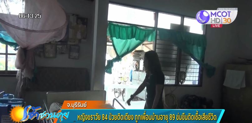 บุรีรัมย์ 5 ก.พ.-สลด! ญาติร้องหญิงชราวัย 84 ปี ป่วยติดเตียง ถูกเพื่อนบ้านชายอายุ 89 ปี บุกเข้าไปข่มขืนถึงในบ้าน ตรวจร่างกายพบร่องรอยล่วงละเมิดทางเพศ หลังออกจากโรงพยาบาล ก็มีอาการป่วยไข้เรื้อรัง นอนมองประตูบ้านน้ำตาไหลตลอดเวลา ก่อนเสียชีวิตด้วยอาการติดเชื้อในกระแสเลือด