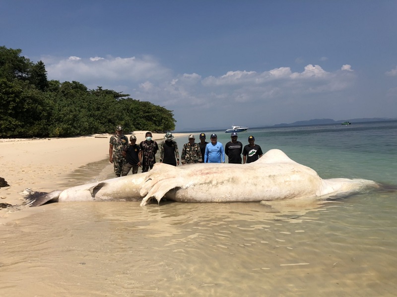 นายวิทยา ขุนสัน หัวหน้าชุดปฏิบัติงานทางทะเล ส่วนอนุรักษ์ทรัพยากรทางทะเล สำนักงานบริหารจัดการทรัพยากรทางทะเลและชายฝั่งที่ 10 (สอท.สบทช.10) กรมทรัพยากรทางทะเลและชายฝั่ง ได้รับแจ้งจากเจ้าหน้าที่อุทยานแห่งชาติหมู่เกาะเภตรา จ.สตูล พบซากสัตว์ทะเลหายากอยู่บริเวณระหว่างอ่าวพังกาใหญ่ เกาะบุโหลนเล พิกัด E 5587716 N 755420 และได้นำซากดังกล่าวเข้ามาไว้ที่เกาะบุโหลนไม้ไผ่ เจ้าหน้าที่ชุดปฏิบัติงานตรวจตราทางทะเลพื้นที่ จ.สตูล จึงนำเรือทรัพยากรฯ 306 เข้าตรวจสอบพบว่าซากฉลามวาฬ ขนาดลำตัวยาว 8.80 เมตร รอบลำตัว 4 เมตร เพศผู้ น้ำหนักประมาณ 2 ตัน สภาพเริ่มเน่า ไม่พบร่องรอยบาดแผล คาดว่าตายมาไม่น้อยกว่า 3-5 วัน พร้อมกันนี้ได้ส่งชิ้นเนื้อให้ศูนย์วิจัยและพัฒนาทรัพยากรทางทะเลและชายฝั่งทะเลอันดามัน จ.ภูเก็ต ตรวจพิสูจน์หาสาเหตุ ส่วนซากฉลามวาฬได้ฝังกลบในพื้นที่