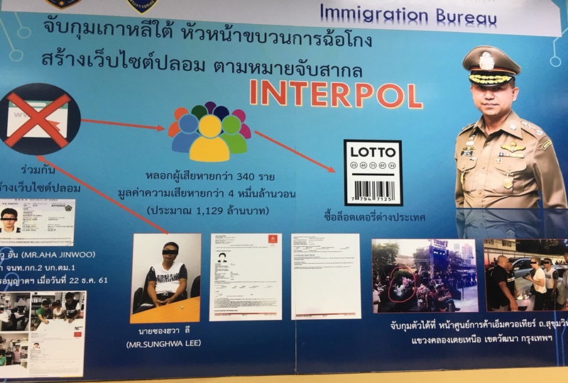 พลตำรวจโทสุรเชษฐ์ หักพาล ผู้บัญชาการสำนักงานตรวจคนเข้าเมือง แถลงผลการจับกุมนายซอง ฮวา ลี (MR.SUNGHWA LEE) ชายชาวเกาหลีใต้อายุ 53 ปี ผู้ต้องหาตามหมายจับสากล หัวหน้าขบวนการฉ้อโกงสร้างเว็บไซต์ปลอมลวงผู้เสียหายกว่า 340 ราย ซื้อสลากกินแบ่งออนไลน์ มีมูลค่าความเสียหายกว่า 1,129 ล้านบาท ซึ่งได้หลบหนีเข้ามายังประเทศไทยโดยผิดกฎหมาย