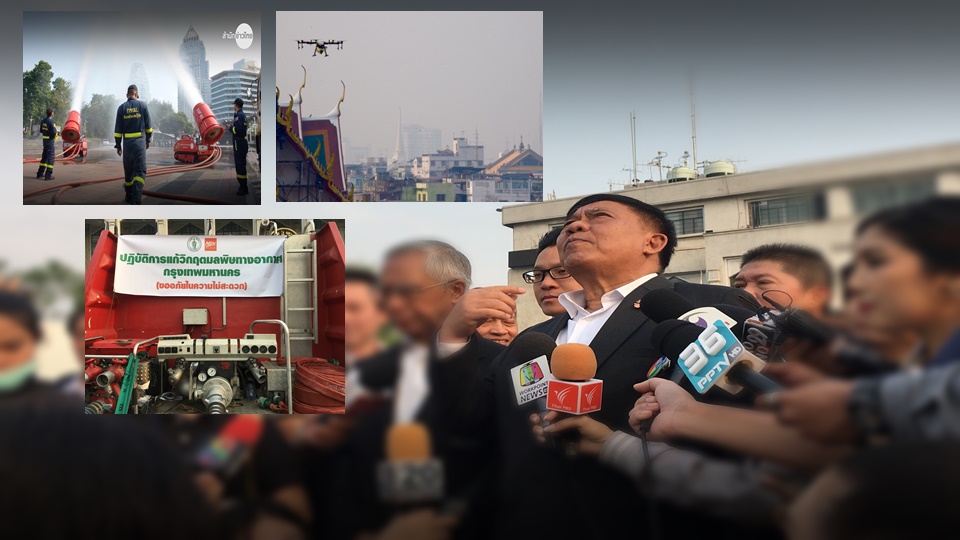 พล.ต.อ.อัศวิน ขวัญเมือง ผู้ว่าราชการกรุงเทพมหานคร(ผู้ว่าฯกทม.) กล่าวถึงความคืบหน้าการแก้ปัญหาฝุ่นละอองขนาด PM 2.5 เกินค่ามาตรฐาน ว่า ขณะนี้คุณภาพอากาศของกรุงเทพมหานครอยู่ในระดับคุณภาพดีเกือบทุกพื้นที่ (สีเขียว)มีเพียงเขตบางเขน ที่อยู่ระดับ 54 ไมโครกรัมต่อลูกบาศก์เมตร ซึ่งเกินค่ามาตรฐาน แต่ไม่นิ่งนอนใจ วันที่7ก.พ.นี้ ที่คาดว่าสภาพอากาศอาจปิดอีกครั้ง กทม.จึงระดมเจ้าหน้าที่ฉีดพ่นละอองน้ำทั้งกลางวันและกลางคืน รวมถึงกองทัพภาคที่1,กรมโยธา ,สำนักสิ่งแวดล้อม,สำนักป้องกันและบรรเทาสาธารณภัย นำรถฉีดล้างถนนหลังเวลา22.00น. รวมทั้งสวนสาธารณะต่างๆ 37 สวนจะระดมฉีดน้ำวันเว้นวัน และวันนี้ (6ก.พ.) ได้ประสานกับกรมการบินพลเรือน ขึ้นบินพ่นละอองน้ำ จำนวน 4 ลำ และจะขึ้นอีกอีกครั้งในวันพรุ่งนี้ด้วย เพื่อป้องกันไว้ก่อน