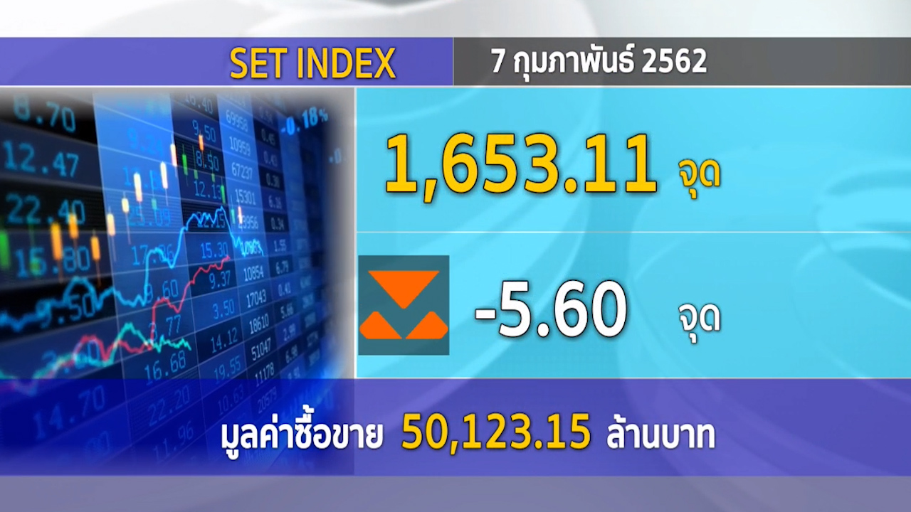 กทม. 7 ก.พ.-ตลาดหุ้นไทย (7 ก.พ.) ปิดการซื้อขายที่ 1,653.11 จุด ลบ 5.60 จุด มูลค่าการซื้อขาย 50,123.15 ล้านบาท.-สำนักข่าวไทย