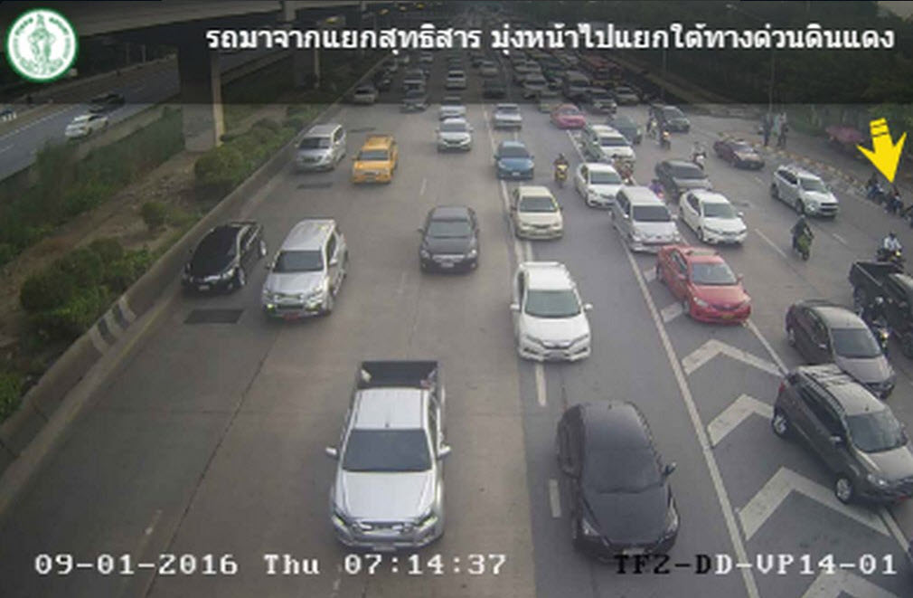 สภาพการจราจร ถนนราชวิถี จากสะพานข้ามแยกดินแดง มุ่งหน้าอนุสาวรีย์ชัยสมรภูมิ รถหนาแน่นติดขัดสลับหยุด ท้ายสะสมไปถนนดินแดง, ถนนวิภาวดีรังสิต