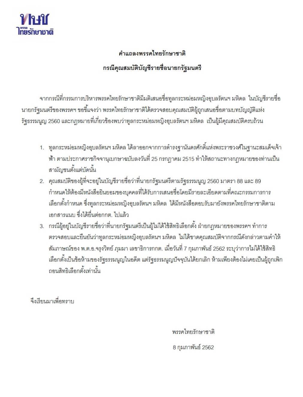 พรรคไทยรักษาชาติ ได้ออกแถลงการณ์ กรณีคุณสมบัติบัญชีรายชื่อนายกรัฐมนตรี ว่าจากกรณีที่กรรมการบริหารพรรคไทยรักษาชาติมีมติเสนอชื่อทูลกระหม่อมหญิงอุบลรัตนราชกัญญา