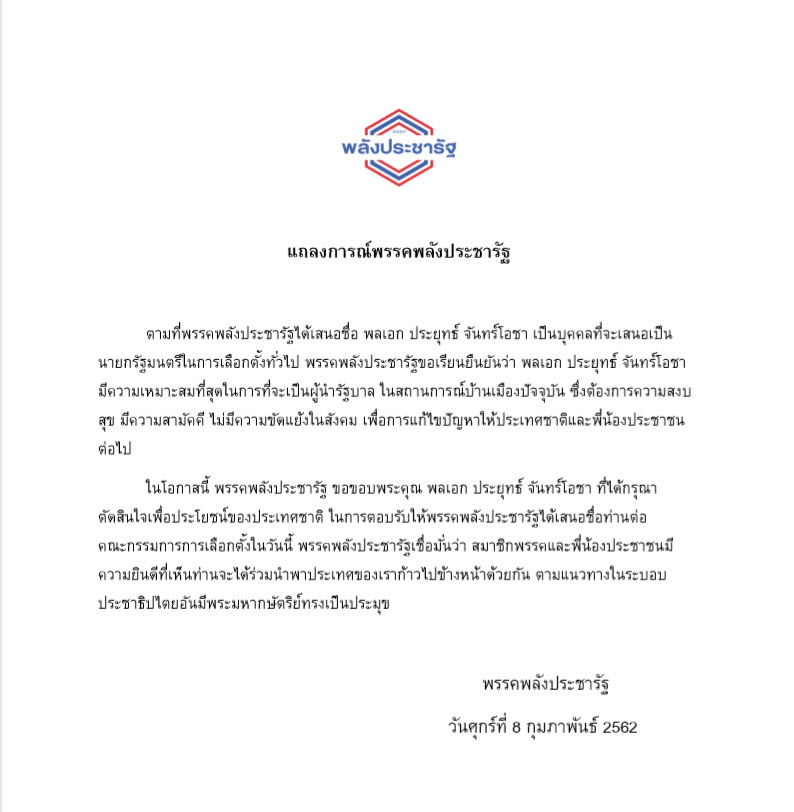 ผู้สื่อข่าวรายงานว่า พรรคพลังประชารัฐออกแถลงการณ์กรณีที่ได้เสนอชื่อ พลเอก ประยทุธ์ จันทร์โอชา เป็นบุคคลที่จะเสนอเป็น นายกรฐัมนตรีในการเลือกตั้งทั่วไป พรรคพลังประชารัฐขอยืนยันว่า พลเอก ประยุทธ์ มีความเหมาะสมที่สุดในการที่จะเป็นผู้นำรัฐบาล ในสถานการณ์บ้านเมืองปัจจุบัน ซึ่งต้องการความสงบสุข มีความสามัคคี ไม่มีความขัดแย้งในสังคม เพื่อการแก้ไขปัญหาให้ประเทศชาติและพีน้องประชาชนต่อไป ในโอกาสนี้พรรคพลังประชารัฐ ขอขอบพระคุณ พลเอกประยุทธ์ ที่ได้ตัดสินใจเพื่อประโยชน์ของประเทศชาติ ในการตอบรับให้พรรคพลังประชารัฐได้เสนอชื่อต่อ คณะกรรมการการเลือกตั้ง ซึ่งพรรคเชื่อว่า สมาชิกและประชาชนมี ความยินดีที่พลเอกประยุทธ์จะได้ร่วมนำพาประเทศของเราก้าวไปข้างหน้าด้วยกัน ตามแนวทางในระบอบ ประชาธิปไตยอันมพีระมหากษัตริย์ทรงเป็นประมุข.-สำนักข่าวไทย