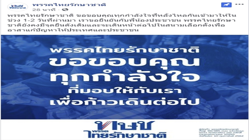 ความเคลื่อนไหวของพรรคไทยรักษาชาติในวันนี้(10 ก.พ.) ได้มีการโพสต์ข้อความในเพจเฟสบุ๊คของพรรคไทยรักษาชาติ เมื่อเวลา 14.30 น. ว่าพรรคไทยรักษาชาติ ขอขอบคุณทุกกำลังใจที่หลั่งไหลกันเข้ามาให้ในช่วง 1-2 วันที่ผ่านมา เราขอยืนยันกับพี่น้องประชาชน พรรคไทยรักษาชาติยังคงมีจุดยืนดังเดิมและจะเดินหน้าต่อไปในสนามเลือกตั้งเพื่ออาสาแก้ปัญหาให้ประเทศและประชาชน