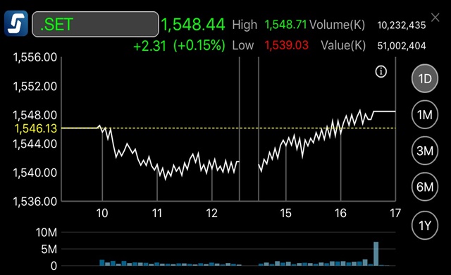 ตลท. 31 ส.ค. – ผู้สื่อข่าวรายงานว่าดัชนีตลาดหลักทรัพย์ปิดตลาดช่วงบ่ายวันนี้ (31 ส.ค.) ที่ระดับ 1,548.44 จุด เพิ่มขึ้น 2.31 จุด หรือร้อยละ 0.15 มูลค่าการซื้อขาย 51,002.40 ล้านบาท โดยดัชนีเคลื่อนไหวทั้งแดนบวก-ลบ ระหว่างวันดัชนีขยับขึ้นแตะจุดสูงสุดที่ระดับ 1,548.71 จุด และดัชนีจุดต่ำสุดของวันอยู่ที่ 1,539.03 จุด