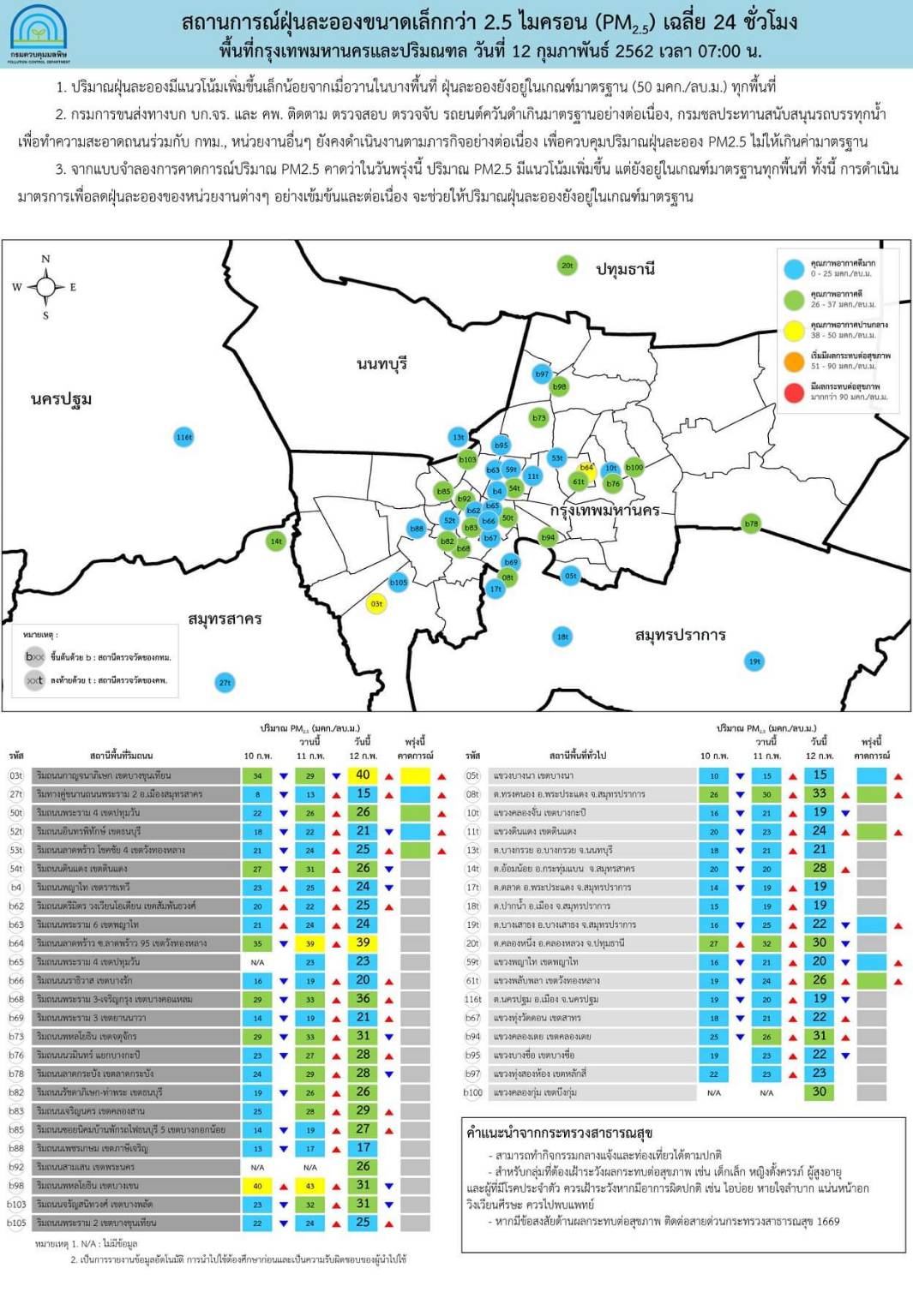 กองจัดการคุณภาพอากาศและเสียง รายงานสถานการณ์ฝุ่นละอองขนาดไม่เกิน 2.5 ไมครอน (pm2.5) ของสถานีตรวจวัดคุณภาพอากาศของกรุงเทพมหานครและสถานีตรวจวัดคุณภาพอากาศของกรมควบคุมมลพิษ ประจำวันอังคารที่ 12 กุมภาพันธ์ พ.ศ. 2562 เวลา 08.00 น ค่าเฉลี่ย 24 ชั่วโมง ของฝุ่นละอองขนาดไม่เกิน 2.5 ไมครอน (PM2.5)