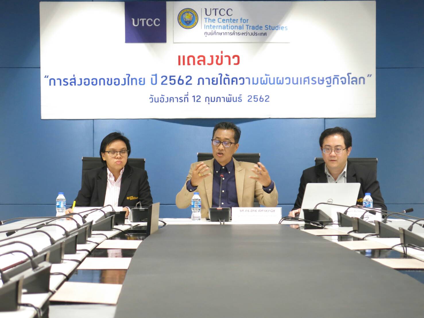 นายอัทธ์ พิศาลวานิช ผู้อำนวยการศูนย์ศึกษาการค้าระหว่างประเทศ มหาวิทยาลัยหอการค้าไทย กล่าวว่า ผลการวิเคราะห์ทิศทางการส่งออกของไทยปี 2562 ภายใต้ความผันผวนเศรษฐกิจโลกของศูนย์ศึกษาการค้าระหว่างประเทศ มหาวิทยาลัยหอการค้าไทย พบว่า การส่งออกของไทยยังคงเผชิญปัจจัยลบมากกว่าปัจจัยบวก โดยเฉพาะปัญหาสงครามทางการค้าที่ยื้ดเยื้อจนส่งผลกระทบต่อทิศทางการขยายตัวของเศรษฐกิจโลก ซึ่งธนาคารโลกคาดการณ์จะขยายตัวร้อยละ 2.5 จากปี 2561 ที่เศรษฐกิจโลกขยายตัวร้อยละ 2.9 รวมถึงเศรษฐกิจสหรัฐและจีน รวมถึงยุโรปที่จะชะลอตัวลงตาม รวมทั้งอัตราแลกเปลี่ยน ของไทยที่แข็งค่ามากกว่าภูมิภาค ราคาน้ำมัน และสินค้าเกษตรที่มีแนวโน้มปรับตัวลดลง รวมถึงการที่สหรัฐ ตัดสิทธิพิเศษทางภาษีศุลกากร หรือจีเอสพีของไทย 11 รายการ และแม้สหรัฐยืดระยะเวลาขึ้นภาษีจากจีน เป็นร้อยละ 25 ออกไปอีก 90 วัน ซึ่งจะส่งผลดีต่อบรรยากาศการค้าโลกให้ผ่อนคลายลง และไทยยังคงมีปัจจัยบวกสำคัญจากการที่สหภาพยุโรป (อียู) ปลดใบเหลืองประมงไทย