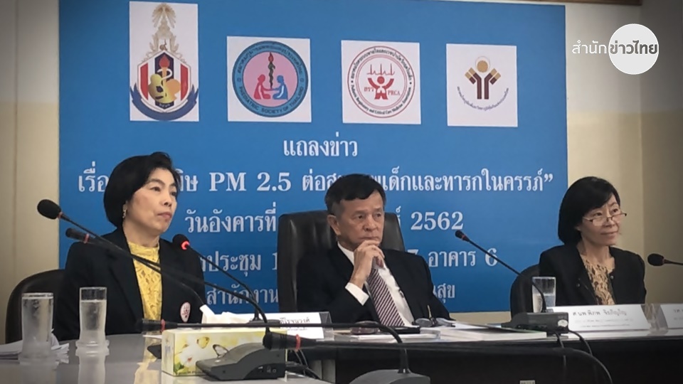 นพ.พิภพ จิรภิญโญ ประธานราชวิทยาลัยกุมารแพทย์แห่งประเทศไทย และนายกสมาคมกุมารแพทย์แห่งประเทศไทย และพญ.พรรณทิพา ฉัตรชาตรี สมาคมโรคภูมิแพ้ โรคหืด และวิทยาภูมิคุ้มกันแห่งประเทศไทย และ พญ.จิตลัดดา ดีโรจนวงศ์ สมาคมโรคระบบหายใจและเวชบำบัดวิกฤตในเด็ก แถลงข่าวมลพิษPM2.5 ต่อสุขภาพเด็กและทารกในครรภ์ ว่า สถานการณ์ ฝุ่นขนาดเล็ก PM 2.5 ขณะนี้มีเกือบทุกพื้นที่ของไทย ซึ่งจะส่งผลกระทบต่อเด็กและในระยะยาว ทั้งเกิดโรคต่างๆ มีตั้งแต่เล็กน้อย เช่น ป่วยระบบทางเดินหายใจ หายช้า จนถึงป่วยมะเร็งก็อาจมีได้ ดังนั้นจึงอยากเรียกร้องให้เร่งแก้ไขปัญหาฝุ่นโดยเร็วให้หมดไปจากประเทศไทยและเพิ่มการตระหนัก พร้อมปรับเปลี่ยนจากคุณภาพอากาศและฝุ่นละอองPM 2.5 ในเท่ากับสากล ขององค์การอนามัยโลก เพื่อส่งสัญญาณเตือนได้อย่างมั่นใจและปลอดภัย