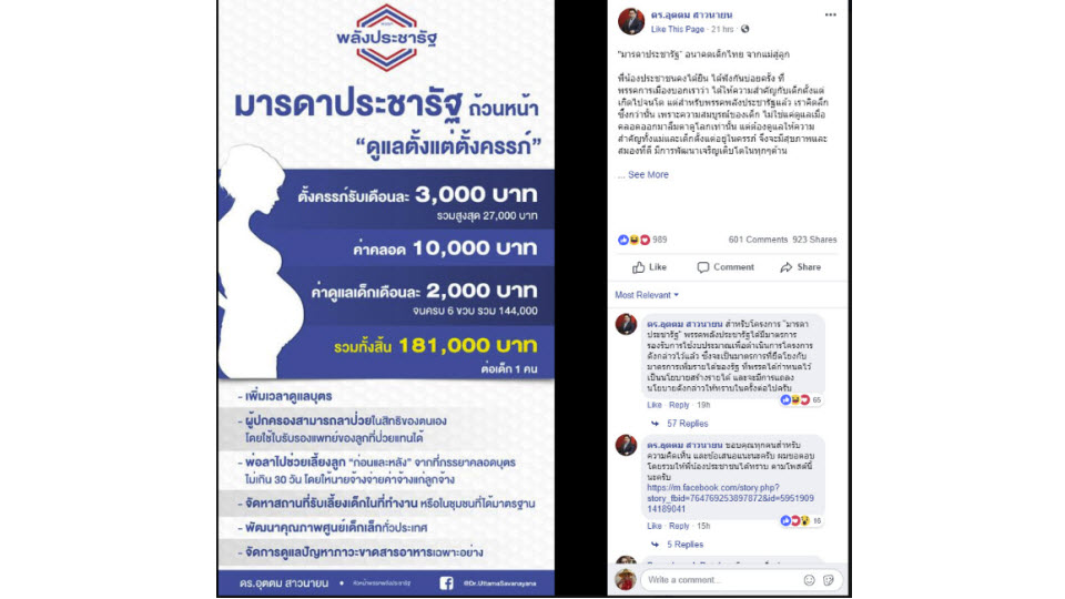 นายอุตตม สาวนายน หัวหน้าพรรคพลังประชารัฐ โพสต์เฟซบุ๊กส่วนตัว เปิดนโยบาย “มารดาประชารัฐ อนาคตเด็กไทย จากแม่สู่ลูก” พร้อมระบุว่า พรรคพลังประชารัฐคิดว่า ความสมบูรณ์ของเด็กไม่ใช่แค่ดูแลเมื่อคลอดออกมาเท่านั้น แต่ต้องให้ความสำคัญทั้งแม่และเด็กตั้งแต่อยู่ในครรภ์ จึงจะมีสุขภาพและสมองที่ดี มีการพัฒนาเจริญเติบโตในทุกๆ ด้าน นโยบาย “มารดาประชารัฐ” จึงจะดูแลมารดาตั้งครรภ์ไปจนถึงคลอด และดูแลต่อไปจนเด็กอายุ 6 ปี