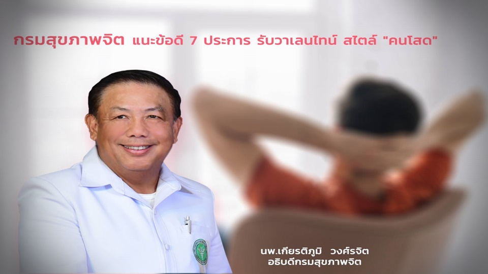 กรมสุขภาพจิต 13 ก.พ.-อธิบดีกรมสุขภาพจิต แนะ 7 ข้อดี รับวาเลนไทน์สำหรับคนโสด ‘ได้รู้จักตัวเองดีมากขึ้น-ได้เรียนรู้การอยู่คนเดียวอย่างมีสุข-ได้เอาอกเอาใจตัวเองฯลฯ’