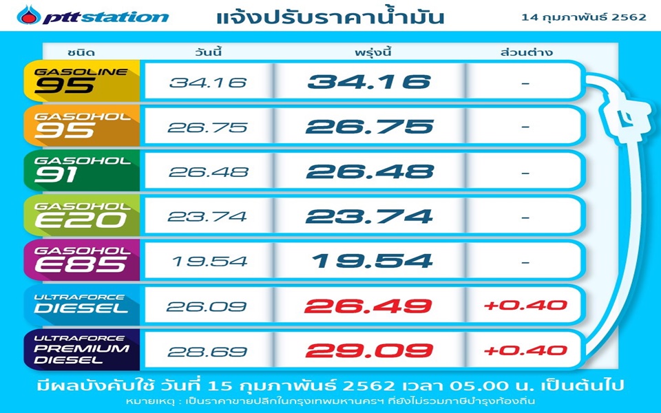 กรุงเทพฯ 14 ก.พ. – ปตท.-บางจากฯ ปรับขึ้นราคาน้ำมันดีเซล 40 สต./ลิตร ส่วนเบนซินและแก๊สโซฮอล์ คงเดิม มีผล 15 ก.พ.