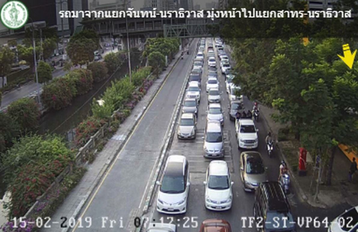 ถนนนราธิวาสฯ ขาเข้า มุ่งหน้าแยกนรินทร การจราจรติดขัด ท้ายแถวสะสมอยู่ที่แยกตัดถนนจันทน์