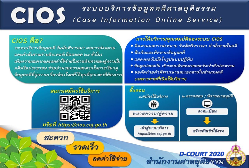 นายสุริยัณห์ หงษ์วิไล โฆษกศาลยุติธรรม เปิดเผยว่า ปัจจุบันศาลยุติธรรมมีความมุ่งมั่นที่จะยกระดับการให้บริการแก่ประชาชนผู้มาติดต่อราชการศาลและคู่ความในคดีให้ได้รับความสะดวกมากยิ่งขึ้น โดยล่าสุดได้พัฒนาระบบบริการข้อมูลคดีศาลยุติธรรม (Case Information Online Service หรือ CIOS) ซึ่งเปิดโอกาสให้คู่ความสามารถสืบค้นและตรวจสอบข้อมูลคำสั่งศาล วันนัดพิจารณา ผลการส่งหมาย และสถานะความคืบหน้าทางคดี ผ่านเครือข่ายอินเทอร์เน็ตได้ทุกที่ทุกเวลาตลอด 24 ชั่วโมง โดยไม่มีค่าใช้จ่าย นอกจากนี้ ระบบ CIOS ยังมีบริการพิเศษให้คู่ความสามารถขอคัดถ่ายเอกสารต่างๆ ในสำนวนคดี เช่น คำฟ้อง คำให้การ รายงานกระบวนพิจารณา ตลอดจนคำพิพากษาของศาล ผ่านระบบออนไลน์ และมีบริการจัดส่งเอกสารให้แก่คู่ความถึงบ้านอีกด้วย โดยไม่ต้องเสียเวลาเดินทางมาศาลแต่อย่างใด ทั้งนี้ คู่ความหรือทนายความสามารถลงทะเบียนเข้าใช้บริการดังกล่าวได้ผ่านเว็บไซต์ https://cios.coj.go.th