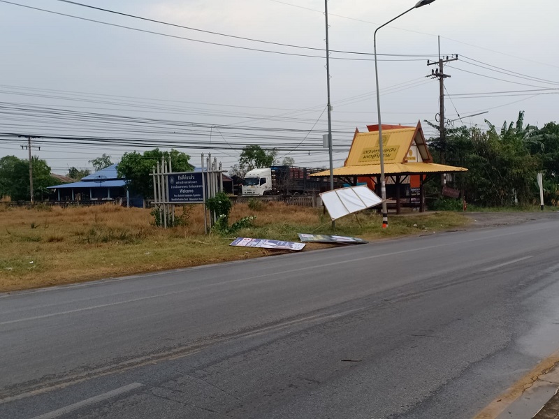 มหาสารคาม 17 ก.พ.- ลมฝนกระหน่ำมหาสารคามสร้างความเสียหายในพริบตา ป้ายโฆษณา ป้ายบอกทาง และป้ายหาเสียงเลือกตั้ง ส.ส.พังระเนระนาด