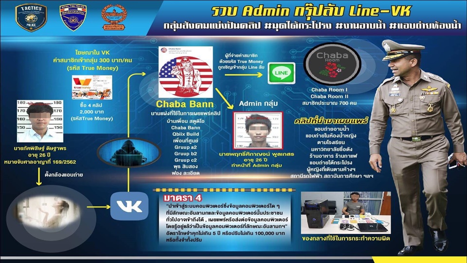กรุงเทพฯ 19 ก.พ.- ตำรวจ รวบ แอดมินกลุ่มลับ ไลน์-วีเค เผยแพร่คลิป หญิงสาวกำลังอาบน้ำ และขายให้สมาชิกอ้างต้องการนำเงินไปใช้หนี้บัตรเครดิต