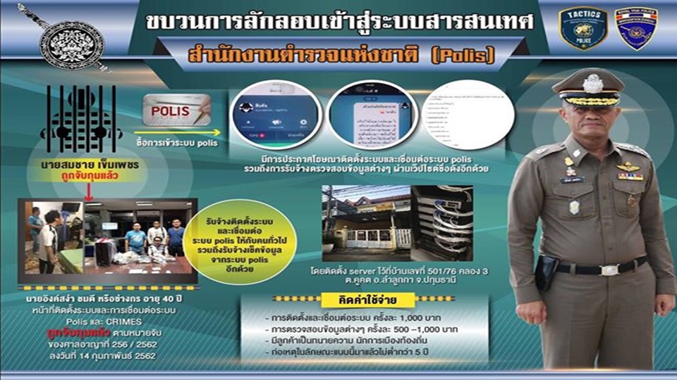 กรุงเทพฯ 19 ก.พ.- ตำรวจ ขยายผล จับช่างเทคนิค ขโมยรหัส ตำรวจ 5 นาย เข้าระบบสารสนเทศ หรือ Polis ของสำนักงานตำรวจแห่งชาติ ก่อนนำข้อมูลไปขายทนาย-พรรคการเมือง