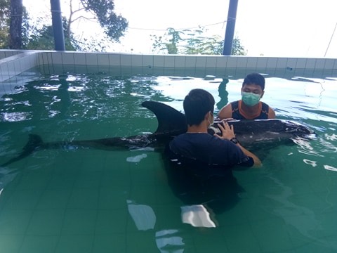 เมื่อเวลา 10.00 น. (19 ก.พ.) เจ้าหน้าที่กลุ่มสัตว์ทะเลหายาก ศูนย์วิจัยและพัฒนาทรัพยากรทางทะเลและชายฝั่งทะเลอันดามัน (ศวทม.) และหน่วยกู้ชีพฯ อาสาสมัครมูลนิธิกุศลธรรมภูเก็ตช่วยกันเคลื่อนย้ายโลมาริซโซส์ เพศผู้ ขนาดลำตัวยาวประมาณ 250 เซนติเมตร น้ำหนัก 100 กิโลกรัม จากรถพยาบาลสัตว์ทะเลหายากเคลื่อนที่ เพื่อนำไปไว้ในบ่ออนุบาลเตรียมให้แพทย์ตรวจรักษาอาการ หลังจากพบโลมาตัวดังกล่าวเกยตื้นบริเวณฝั่งตะวันออกของหาดไร่เลย์จังหวัดกระบี่ เมื่อเย็นวันที่ 17 ก.พ.ที่ผ่านมา สภาพอ่อนแรง ไม่สามารถทรงตัวว่ายน้ำได้ นอกจากนี้ ยังพบบาดแผลบริเวณโหนกหัวด้านซ้าย ซึ่งเจ้าหน้าที่จึงช่วยกันนำโลมาไปไว้ที่บ่อเลี้ยงชั่วคราวของศูนย์วิจัยและพัฒนาประมงชายฝั่งกระบี่ ก่อนเคลื่อนย้ายมาที่ศูนย์วิจัยฯ ภูเก็ตวันนี้ โดยเจ้าหน้าที่ยังต้องช่วยพยุงตัว ให้ยา และสังเกตอาการตลอด 24 ชั่วโมง