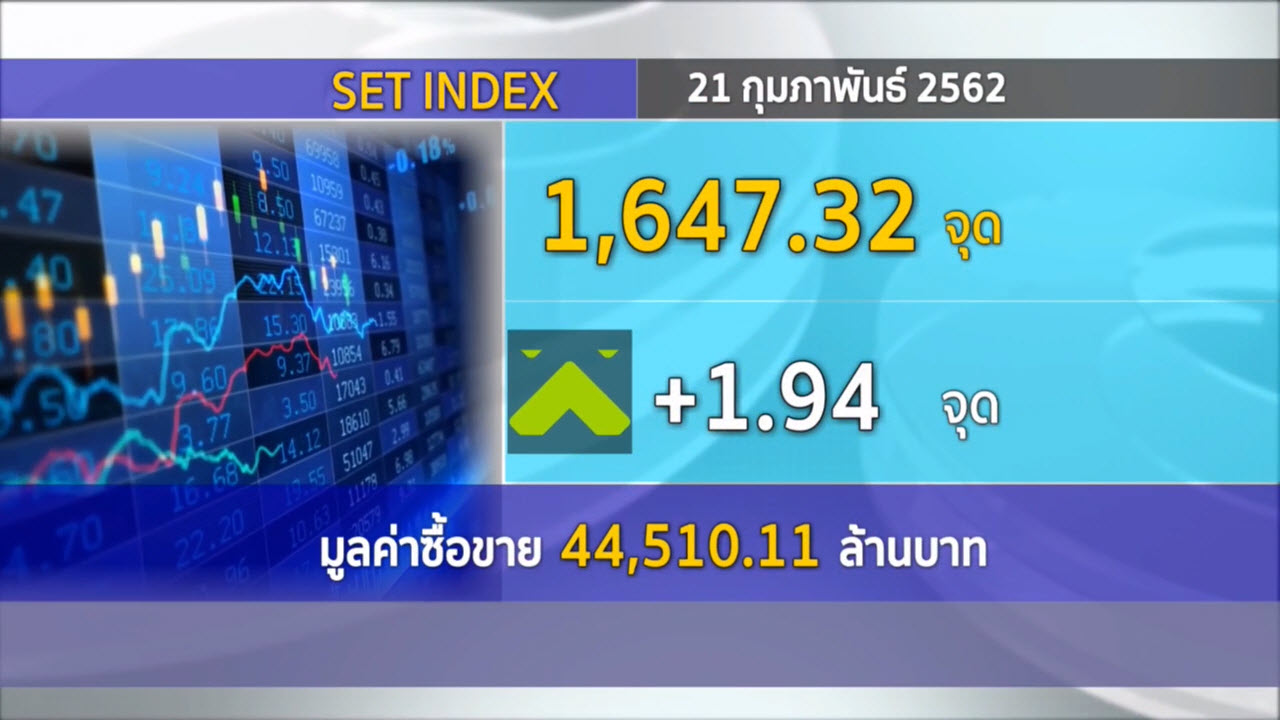 กรุงเทพฯ 21 ก.พ.-ตลาดหุ้นไทย (21 ก.พ.) ปิดการซื้อขายที่ 1,647.32 จุด บวก 1.94 จุด มูลค่าการซื้อขาย 44,510.11 ล้านบาท .-สำนักข่าวไทย