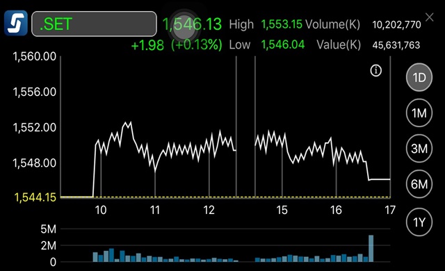 ตลท. 30 ส.ค. – ผู้สื่อข่าวรายงานว่าดัชนีตลาดหลักทรัพย์ฯ ปิดตลาดวันนี้ (30 ส.ค.) ที่ระดับ 1,546.13 จุด ปรับขึ้น 1.98 จุด มูลค่าการซื้อขาย 45,631.76 ล้านบาท โดยดัชนีเคลื่อนไหวแดนบวกทั้งวัน ระหว่างวันดัชนีขยับขึ้นแตะจุดสูงสุดที่ระดับ 1,553.15 จุด และต่ำสุดของวันอยู่ที่ 1,546.04 จุด