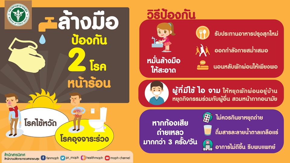 นพ.สุขุม กาญจนพิมาย ปลัดกระทรวงสาธารณสุข ให้สัมภาษณ์ว่า ขณะนี้ประเทศไทยเข้าสู่ฤดูร้อน เชื้อโรคต่างๆเจริญได้ดีในสภาพอากาศร้อน กระทรวงสาธารณสุข (สธ.) ขอแนะนำเคล็ดลับป้องกันการเจ็บป่วยวิธีง่าย ๆ ด้วยการหมั่นล้างมือ ทั้งก่อนปรุงอาหาร ก่อนรับประทานอาหารและหลังเข้าห้องน้ำทุกครั้ง เนื่องจากมือเป็นอวัยวะที่นำเชื้อโรคเข้าสู่ร่างกายได้ทั้งทางจมูก ปาก และผิวหนัง เป็นสาเหตุให้เจ็บป่วยด้วยโรคที่พบได้บ่อยคือ อุจจาระร่วง ไข้หวัด ไข้หวัดใหญ่