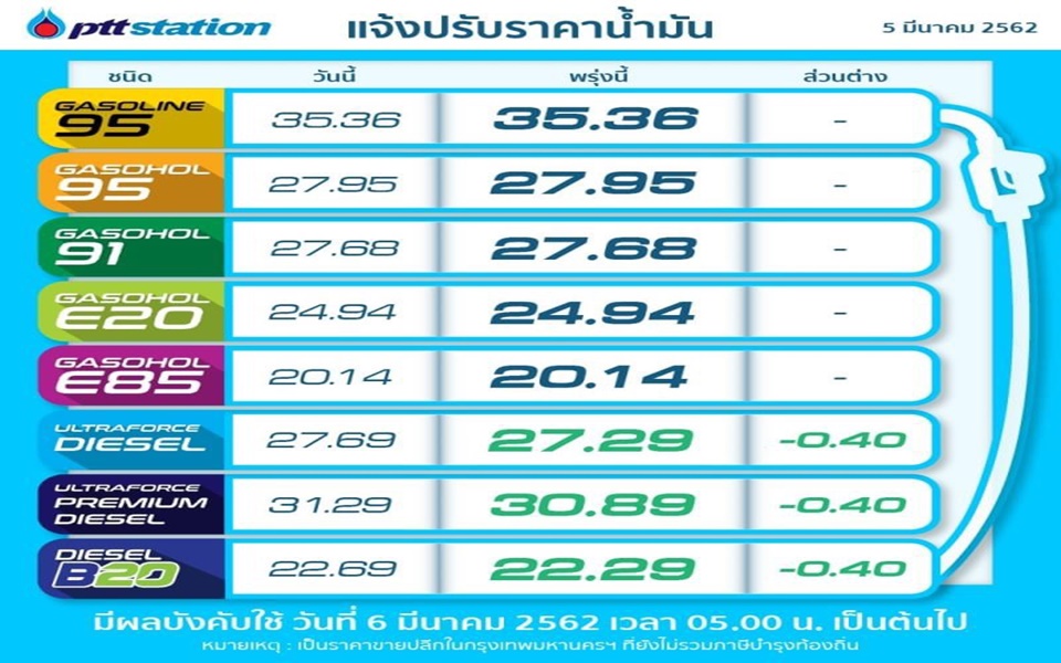 กรุงเทพฯ 5 มี.ค. – ปตท.-บางจากฯ ปรับดีเซล 40 สต/ลิตร ส่วนชนิดอื่นคงเดิม มีผล 6 มี.ค.นี้