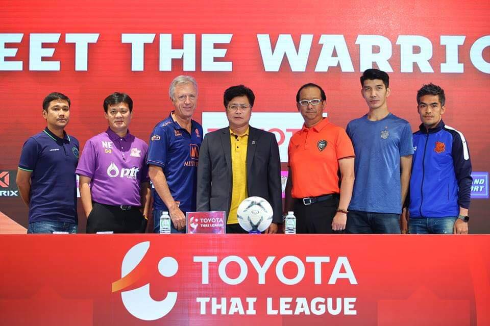 กรุงเทพ -7 มีนาคม 2561 การกีฬาแห่งประเทศไทยฯ สมาคมกีฬาฟุตบอลแห่งประเทศไทยฯ ร่วมกับ บริษัท ไทยลีก จำกัด และ บริษัท โตโยต้า มอเตอร์ ประเทศไทย จำกัด จัดงานแถลงข่าวก่อนการแข่งขันคู่ระหว่าง บุรีรัมย์ ยูไนเต็ด กับ พีที ประจวบ เอฟซี