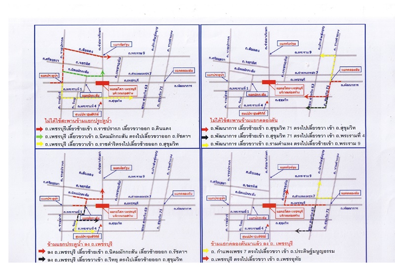 1. เส้นทางพื้นราบ แนะนำให้ใช้ ถนนพระราม 9, ถนนสุขุมวิท, ถนนกำแพงเพชร7, ถนนเพชรอุทัย, ถนนนิคมมักกะสัน, ถนนจตุรทิศ, ถนนราชปรารภ, ถนนชิดลม, ถนนวิทยุ, ถนนสุขุมวิท 3,ถนนสุขุมวิท 55 และ ถนนสุขุมวิท 63