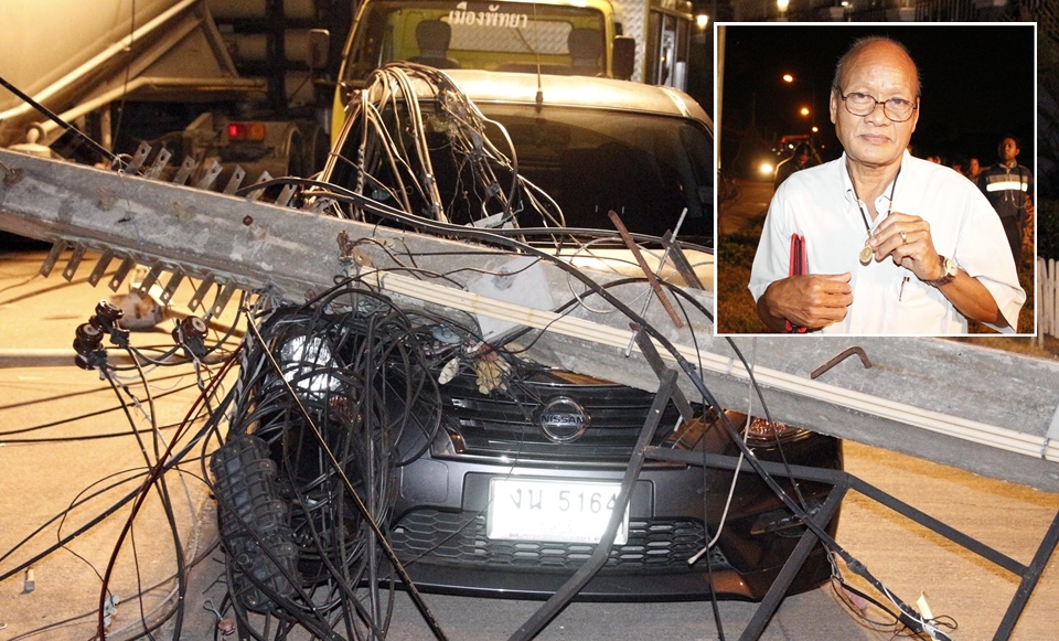 ชลบุรี 9 มี.ค.-รถปูนขนาดใหญ่เลี้ยวไม่พ้นเกี่ยวสายไฟ กระชากเสาไฟฟ้าแรงสูงล้มระเนระนาด ทับรถเก๋งผู้จัดการโรงแรม ไฟชอร์ตสนั่น คนขับรีบหนีออกจากตัวรถ รอดตายราวปาฏิหาริย์