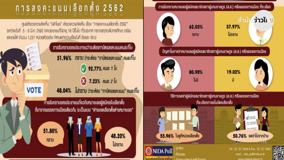 ศูนย์สำรวจความคิดเห็น “นิด้าโพล” สถาบันบัณฑิตพัฒนบริหารศาสตร์ (นิด้า) เปิดเผยผลสำรวจความคิดเห็นของประชาชน เรื่อง “การลงคะแนนเลือกตั้ง 2562” ระหว่างวันที่ 5 – 6 มีนาคม 2562 จำนวน 1,251 หน่วยตัวอย่าง เกี่ยวกับการลงคะแนนเลือกตั้ง ปี 2562 พบว่า ประชาชนส่วนใหญ่ ร้อยละ 51.96 ทราบว่า การเลือกตั้งครั้งนี้ ต้องการบัตรลงคะแนนคนละกี่ใบ และในจำนวนนี้ตอบถูกว่า ต้องกาบัตร 1 ใบ ถึงร้อยละ 92.77 ขณะที่ ร้อยละ 48.04 ระบุว่า ไม่ทราบ ว่าจะต้องกาบัตรลงคะแนนคนละกี่ใบ